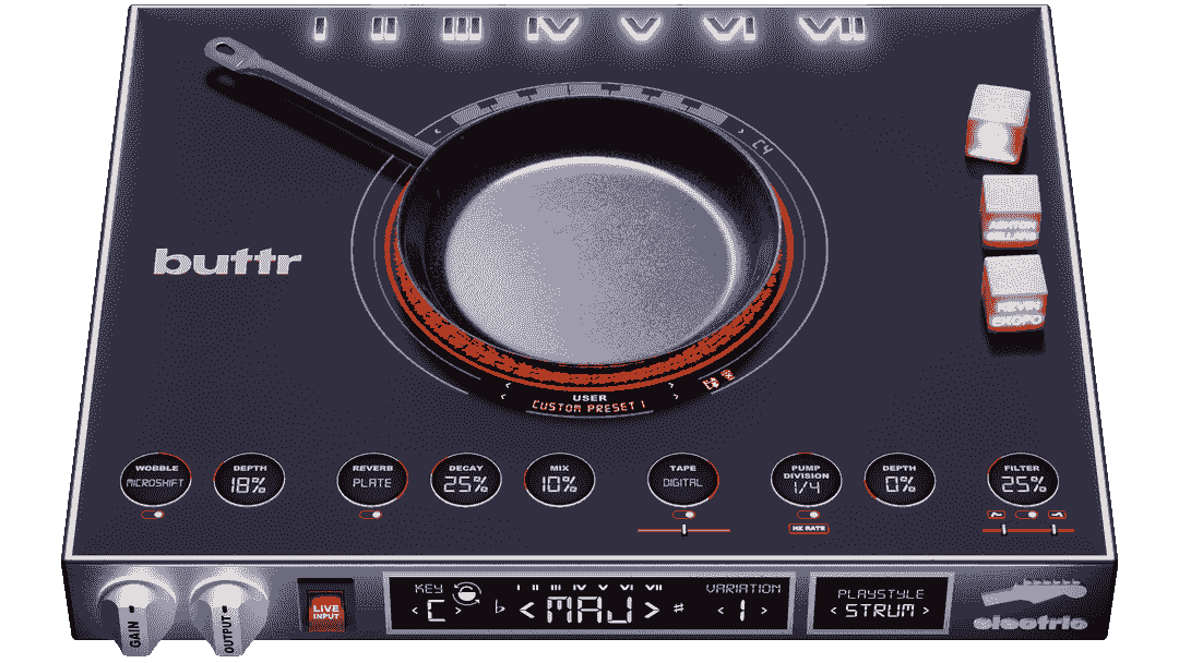 Video showing the Buttr user interface's display, showing MAJ, MIN, DOM7, DIM.